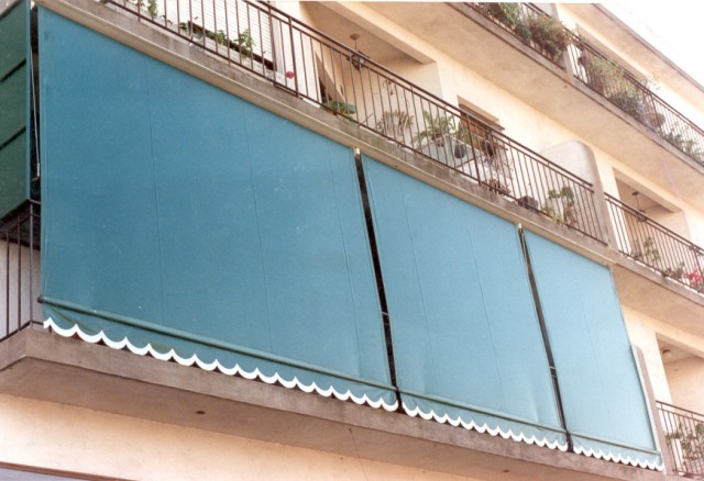 Descripcion: Están pensados especialmente para toda clase de balcones y ventanales, presentándose en dos opciones: vertical tipo telón o separado de la barandilla, en este último caso sobresaliendo medio metro fuera del balcón, gracias a su singular sistema de brazos que se sujetan de forma tensa a la barra inferior del toldo.